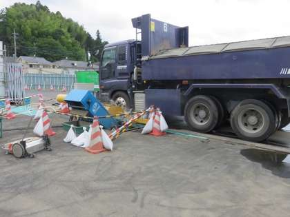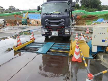 工事用車両のタイヤ周りの汚れも、洗浄装置できれいにしていました。