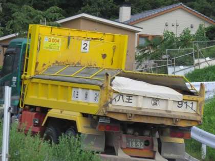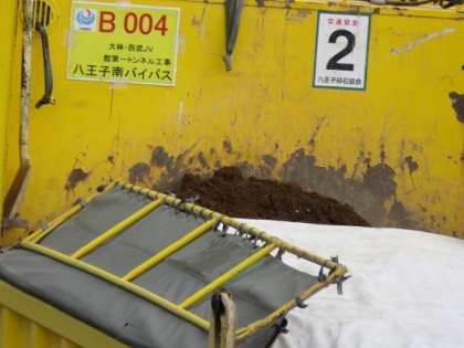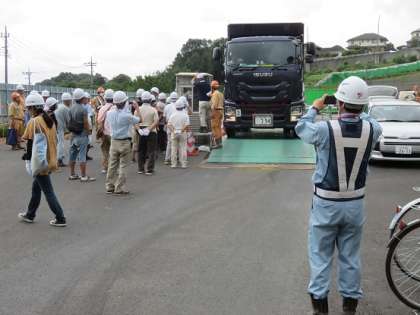 道路を通行したり、路上で駐車したりするときに、関係する工事と分かるように、土砂搬出用の工事用車両には、表示をしていただけていました。また、着用されているヘルメットの後ろにお名前が記載されていました。