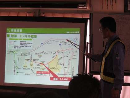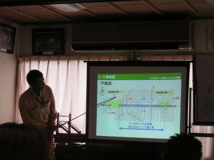 現地見学会に先立って、殿入会館で、工事説明会が行われました。この日の現地見学会は、館町町会のみなさんの要望を受けて行われたとお聞きしています。