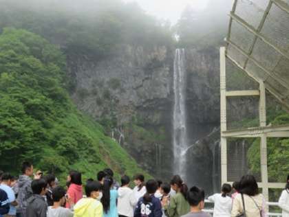 朝の澄み切った中、子どもたちは、華厳の滝の美しさに触れることができました。滝を背景にしたクラスごとの集合写真を撮っていただいたあとに、子どもたちは一つ上の展望デッキに上がり、滝を眺めたり、思い思いに写真を撮ったりしていました。一般の観光の方も多く居ましたし、他の学校も次々に見学に降りてきていましたが、本当に上手に見学ができていました。