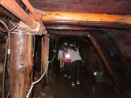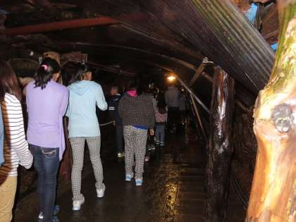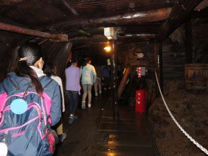 銅山の坑道内の見学になった子どもたちは、坑道内の薄暗さから、“お化け屋敷”的感覚で前の人に続いて歩いていました。