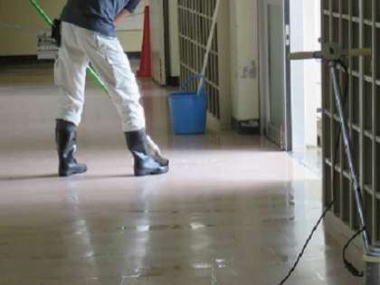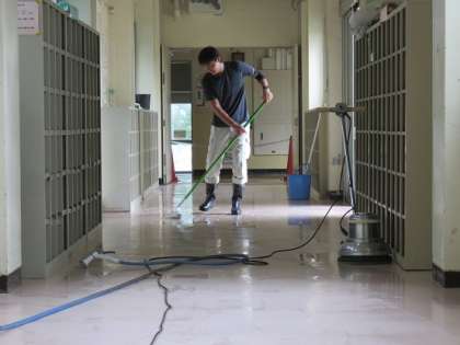 そこで、子どもたちが登校しない夏休みに、ポリッシャーを使い水洗いをしたり、乾いたあとにワックス掛けをしたりしています。