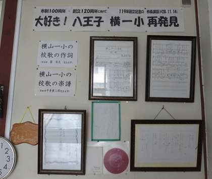 『校歌』を創られたお二人の先生の直筆の原稿や楽譜のコピーやソノシートなどは、北校舎の事務室の受付のところに掲示してあります。