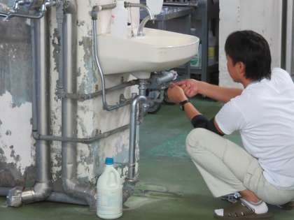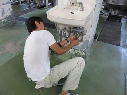 校舎内の廊下の洗浄・ワックス掛け作業のほかに、給食室内の水道の修繕も行います。調理備品の修繕などの大きな修繕は、専門の業者の方に、夏休みの時期に適宜してもらっていますが、ちょっとした修繕は、校内の用務主事さんが行い、二学期の給食調理が円滑にできるようにしています。