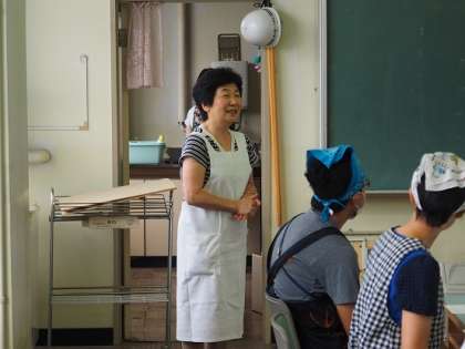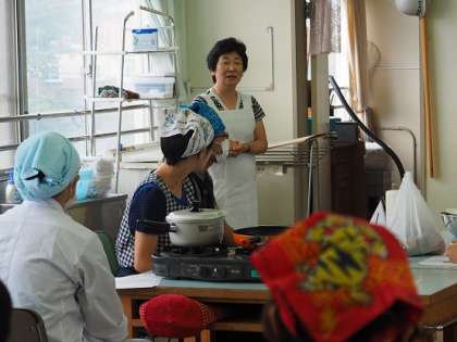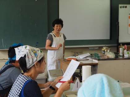 研修会が始まり、早速、小口悦子先生のお話がありました。“地場野菜”という視点からは、八王子は、さまざまな野菜が生産されていることもあり、“たまねぎ”などと絞らずに、夏野菜のおいしさを味わえるメニューを考えられたそうです。