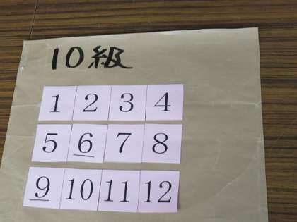 漢字検定を受験する子どもたちが間違いないように、受付で、級ごとに色分けされた数字カードをもらい、同じ色の数字カードが受験する教室の机に張ってあります。