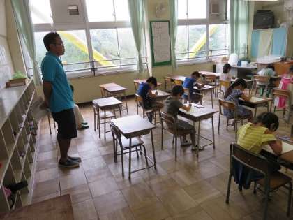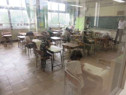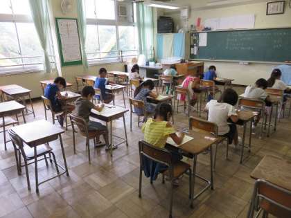 試験開始の校内放送が聞こえると、子どもたちは、一所懸命に答案用紙に向き合っていました。