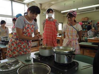 他校の先生方には、初めて使う方向の家庭科室、そして、調理機器・調理器具ですので、煮え具合の見守りには、目が離せません。