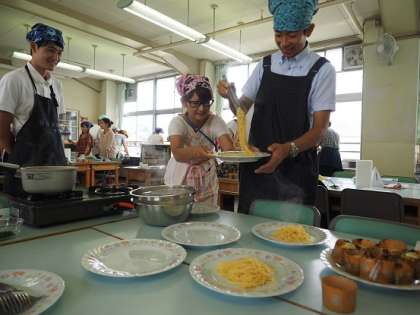 茹で上がった麺は、各グループが、手早くお皿に盛り付けをしていました。