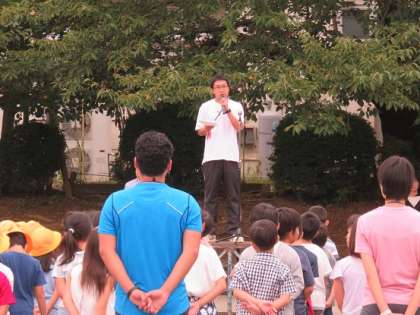 月曜日は、校庭や体育館で、全校のみんなが集まって、児童朝会を行います。校長先生の講話や先生方のお話があります。