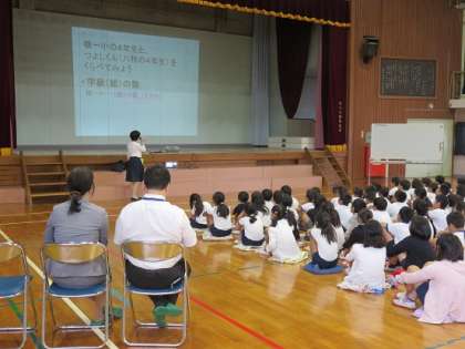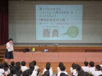 4年生がよく理解できるように、横一小と比較しながら、八王子特別支援学校の様子を詳しく教えてくれました。副籍交流で来ている友だちの担任の先生の写真を見せてくれてりしました。