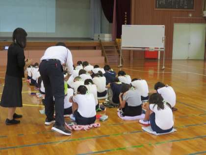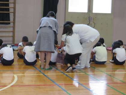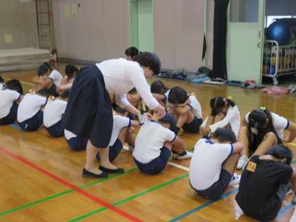 先生方が、手分けをして、4年生全員の背中に、絵カードを洗濯ばさみに挟んで、付けてくれました。