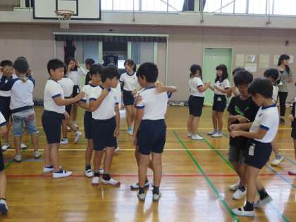 洗濯ばさみで、自分の背中に絵カードが付けられた4年生は、ジェスチャーなどをしたりと工夫して、一人、また一人と、同じ絵カードの人を集めていました。