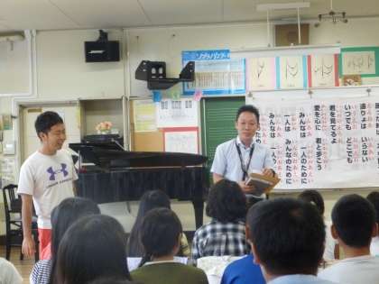 まずは言葉を母音だけで発音してみるという練習をしました。何ともおかしな言い方なので、子供たちからも笑みがこぼれます。最初は恥ずかしそうにしていた子どもたちですが、やり方を理解して楽しそうにセリフを発音する姿がありました。母音だけでセリフを言おうとすると、発音しにくいので、口を大きく動かす必要があります。そこに子音を付けてセリフを言うと、はっきりとした発音になり、その違いがよく分かったようです。