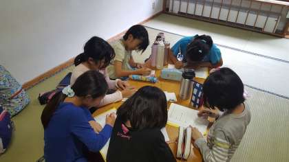 宿舎についた後は、荷物整理をしたり、今日の学習の振り返りをしたりして過ごします。明日のための準備として、水稲もきちんと洗って干します。班のみんなで協力し、今、何をすべきか考えながら行動している姿は立派です。