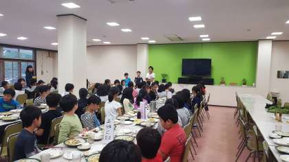 夕食は、大食堂でみんなで食べます。今日の疲れも忘れて、友達と仲良くおしゃべりしながら食べていました。