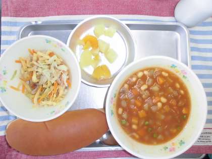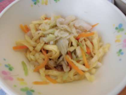 本日のサラダは「たぬきサラダ」です。キャベツとにんじんのサラダに、カリカリに揚げたワンタンの皮が入っています。かつおぶし粉を混ぜ、おしょうゆの香る和風な味つけにしました。