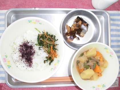 本日の魚は、「さんま」です。さんまは、「秋刀魚」と書き、秋が旬のお魚です。肌寒い日が続き、さんまに脂がのってくる時期になりました。骨まで柔らかく、食べられるようじっくり煮たさんまは、子どもたちからも好評です。
