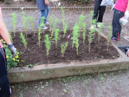 予鈴がなり、子どもたちは足早に教室に戻り、5時間目の授業を受けます。花の会の皆さんが、花壇に植えられたコスモスの苗の根元を一つ一つ軽く押しながら、花壇の土と苗の周りの土の定着が上手にできているかを確かめてくれています。