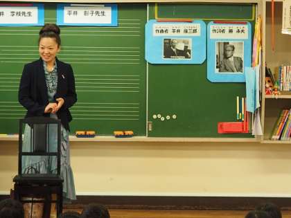 6年生の子どもたちは。平井李枝先生から、校歌を作られたお祖父様の康三郎先生についてのお話をお聞きしました。そして、康三郎先生が、日本の音楽教育を発展させる活動の中で、本校の校歌を作詞された勝 承夫先生とご一緒に、多くの学校で校歌を作られたことも教えてもらいました。