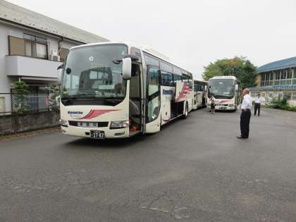 ※写真は、姫木平移動教室へ出発するために、子どもたちが乗る観光バスが、ゆとりをもって本校の駐車場に到着して、待機しているところです。
