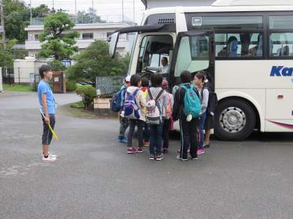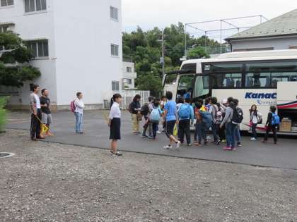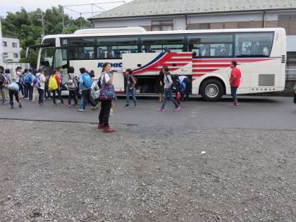 ※写真は、子どもたちが、大きな荷物をバスの下の置き場に置いて、バスに乗り込むときのものです。
