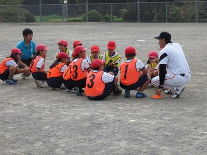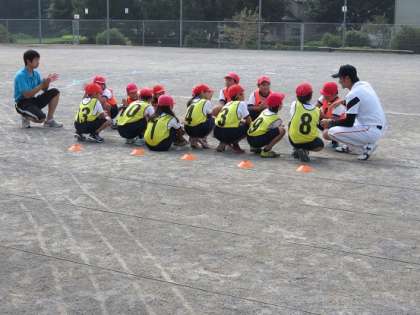 両チームの全員が一回ずつ投げ、ゲームが終わった後、コーチは、子どもたちを集めて振り返りをしました。遠くへ飛ばせる正しい投げ方だけでなく、相手に受け取りやすいボールの投げ方、チームの力の合わせ方などのお話がありました。