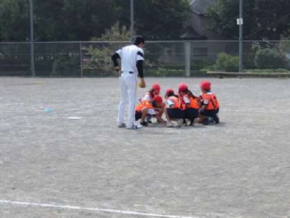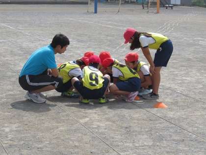 2回戦目のゲームでは、ホームにいるキャッチャー役を、1回戦とは違って、子どもたちがやることになりました。そこで、ポジション決めなど、チームごとに作戦会議をしました。