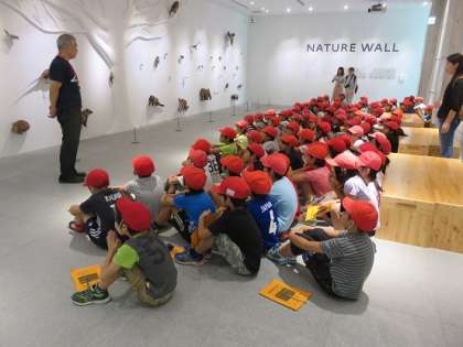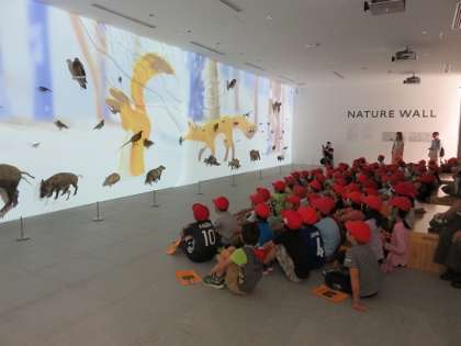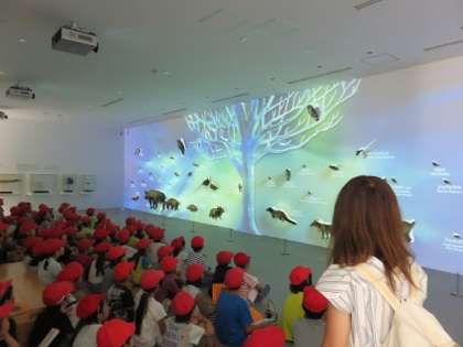 高尾599ミュージアムでは、最初に係の方からのお話をお聞きして、そして、壁面に映し出された、魅力的な映像に、子どもたちは見入っていました。