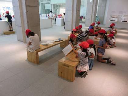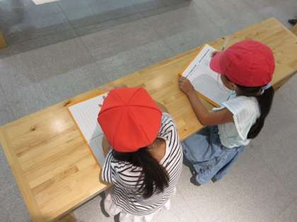 展示物を見たあとに、しおりにその感想や分かったことを書き留めようとうとする子も見られました。他の人の邪魔にならないように、木製の椅子を机代わりにして、記録をまとめている子もいました。