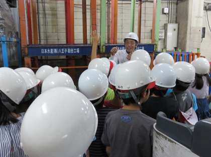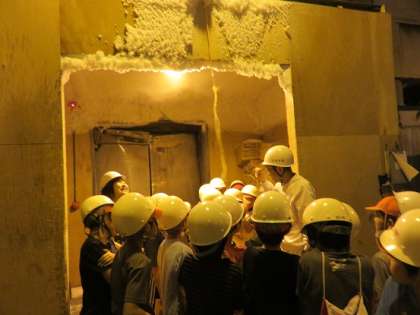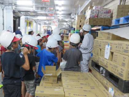 ヘルメットを被った子どもたちは、室温10度の冷蔵庫に入りました。そこでは、フォークリフトの車がたくさんの荷物を移動させていました。