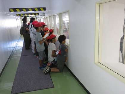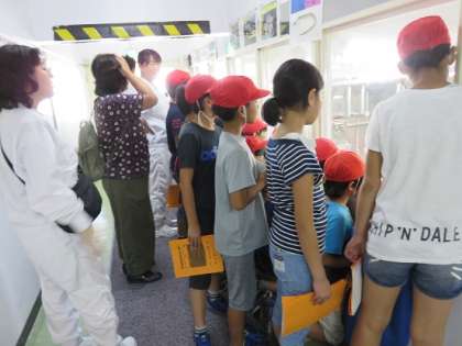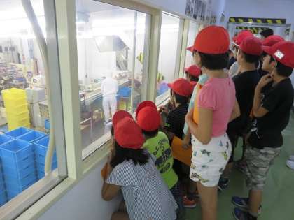 子どもたちは、ソーセージ工場やカニフレーク工場も見学しました。工場の中の様子を覗ける窓の所で、係の方に説明をしていただいていました。窓から覗き込むときに、前列の子がしゃがむと全員が見えるとことを、一度先生から教えてもらうと、3年生は、自分の後ろにいる人を意識して、自発的にしゃがめる子が多く見られました。