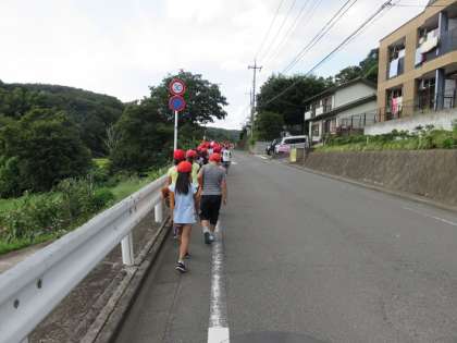 大きな道路に観光バスを止めて、そこから資料館まで歩いていきました。朝8時30分から始まった社会科見学でしたので、子どもたちの集中力も切れてしまうかなと思われましたが、狭い道の歩い方も車に気をつけてきちんと歩けていました。