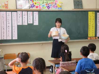 前の時間に、子どもたち一人ひとりが書いたカードを先生に見てもらっていたので、学習が始まると、みんなに配ってもらっていました。
