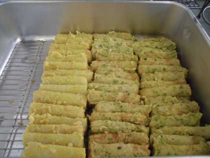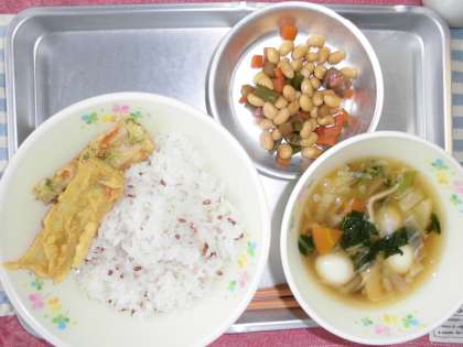 ちくわの二色揚げは、青のりとカレー粉で2つの味を付けました。調理員さんがきれいに並べてくれました。トングで取り出しやすいように、並べてもらっています。