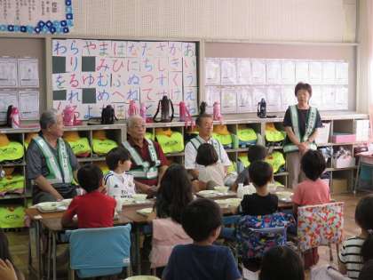 日頃、登下校の安全見守りでお世話になって地域の皆さんを、『ふれあい給食』にお招きしました。お仕事やご用事でお忙しい中、12人の皆さんがご都合をつけていただくことができました。
