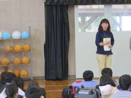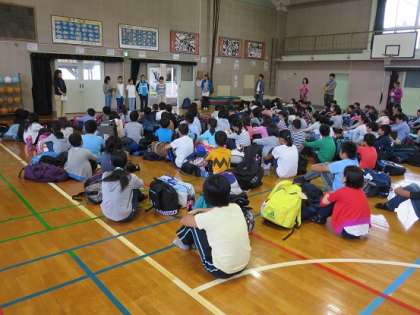 1日目の朝に荷物を持って登校した5年生は、体育館に集合しました。そして、実行委員会などの係の児童が、司会となって、『出発式』が行われました。