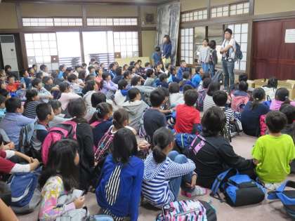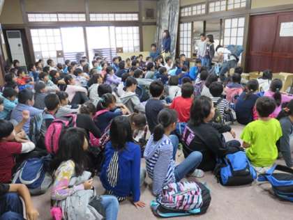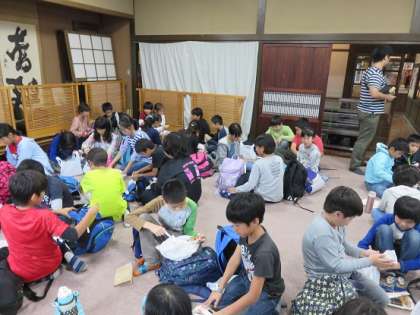 一日目のお昼は、降雨を考え、和紙の里の広間をお借りすることができました。お互いにスペースを融通し合って、食事係の子どもの合図で食べ始めました。