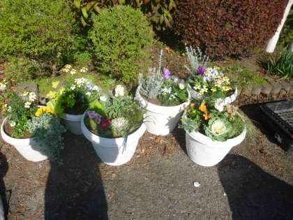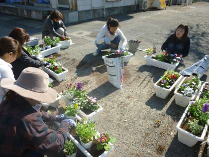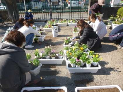 今日は花の会のボランティアのみなさんたちが、式典を華やかに飾ろうと、お花の苗を植えてくださいました。大きなプランターにはいろいろなお花を組み合わせてアレンジメントを作っています。当日はこのお花たちが玄関や体育館までの通路に飾られます。ありがとうございます。