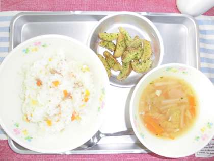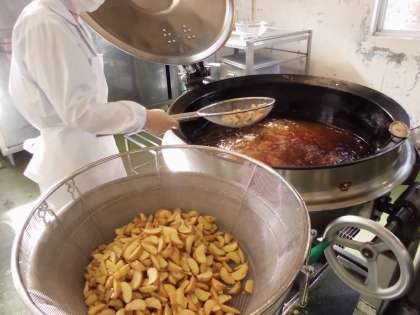 本日は、ベイクドポテトを食べてもらいました。揚げたポテトは、温かいうちに青のりと塩をまぶしていきます。とても甘みのあるじゃがいもでした。