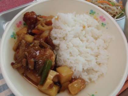オレンジ酢豚には、お砂糖のかわりにマーマレードジャムを入れています。オレンジの風味がとてもよくでていました。オレンジ酢豚は、韓国の給食でもとても人気があるそうです。