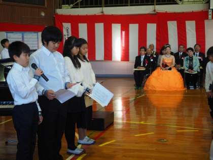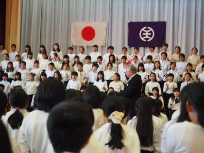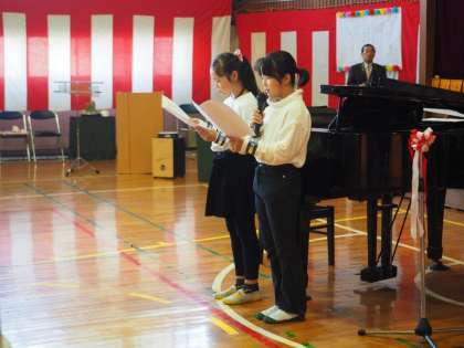 そして最後は、在校生代表として5・6年生の発表、「私たちの120周年」です。これまでみんなで作り上げてきた愛唱歌と、50年間歌い継がれてきた校歌を心を込めて歌います。児童代表の言葉と歌で、会場においでいただいた来賓の皆様に感謝の気持ちを伝えました。