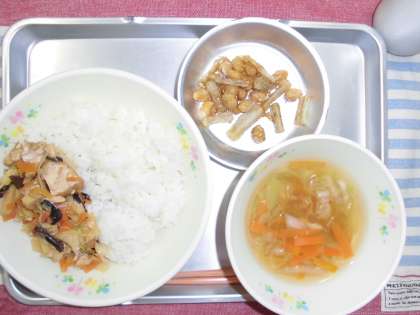 本日のおかずは、「ごぼうと大豆のかりんと揚げ」です。拍子切りにしたごぼうと、ゆでた大豆にでんぷんをまぶし、カリッと揚げました。そこに、あまじょっぱいタレをかけて、和えます。大豆そのものが苦手な子でも、揚げて味をつけることで、よく食べるようになります。