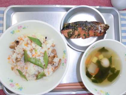 今日の献立は、七五三にちなんで、それぞれの数字がついた料理です。「七」は七宝汁、「五」は五目ちらしずし、「三」は三味焼きです。