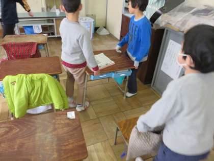 流し台だけでなく、教室の中でも、頑張る子どもたちの姿がありました。1年生の教室掃除の当番の人が、掃き掃除のために一度後ろに移動させた机やいすを元の場所に運んでいました。床をズルズルと引きずるのではなく、二人一組になって、持ち運んでいました。