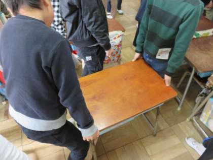 このように机を運ぶと、床のゴミを散らばさせないというだけでなく、体力づくりにも役立ちます。物を持ち上げるときに使う『背筋力』を鍛えてくれます。また、二人組で運ぶので、相手の人と気持ちを揃えたりするタイミングの取り方も上手になります。