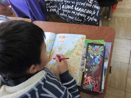 授業の始めに、子どもたちは、地理的な知識を増やし、地図に慣れ、強くなるために、
