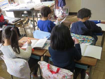 黒板に張られた絵をもとに作られた文章問題の問題文を、ノートに一人ひとり正確に書き写して、文章題で、分かっている事柄にアンダーラインで印をつけていました。