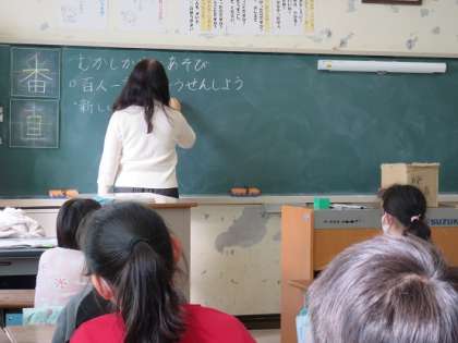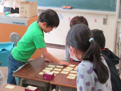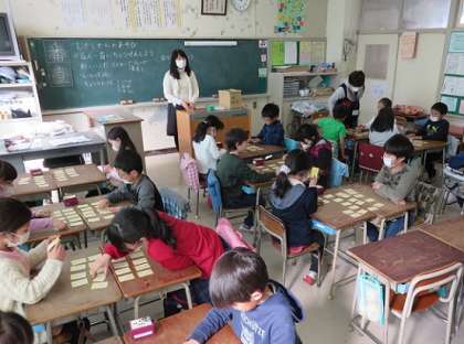 2年生は、生活科の学習で、昔から伝わる遊びについて勉強をしています。『百人一首に「ちょうせんしよう』で、二人で向かい合って、先生の読んでくれる上の句を手がかりに、カルタを一所懸命に取り合っていました。