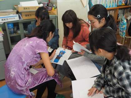 最初は6年1組との交流です。子供たちは、それぞれグループに分かれて調べ学習を行い、テーマごとに日本の良さについてまとめました。